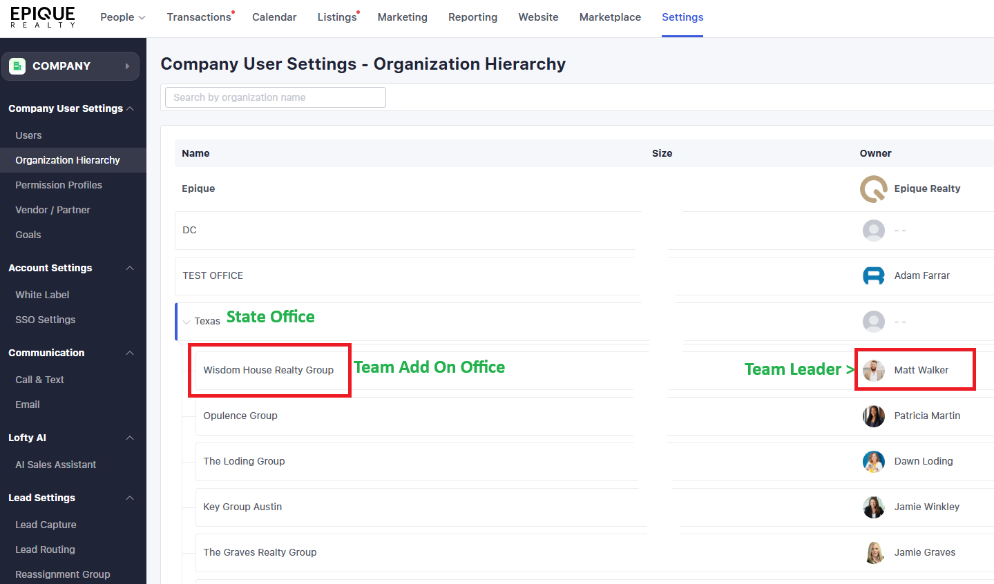 A Team Office in Lofty is part of the organizational hierarchy. On the Epique Lofty platform, the company is at the highest level, followed by the states/provinces, and within those states/provinces are the Team Offices. As a matter of practice, the Team Office is organized under the state office of the team leader's primary license (typically the state they reside in). This doesn't interfere with any agent function in Lofty. Agents will still have access to their state lead pond. Below is a screenshot of what the organizational hierarchy looks like in Lofty with Team Offices. You won't see this on your account, but this is to provide clarity as to how the Team Add On fits into the Epique platform.